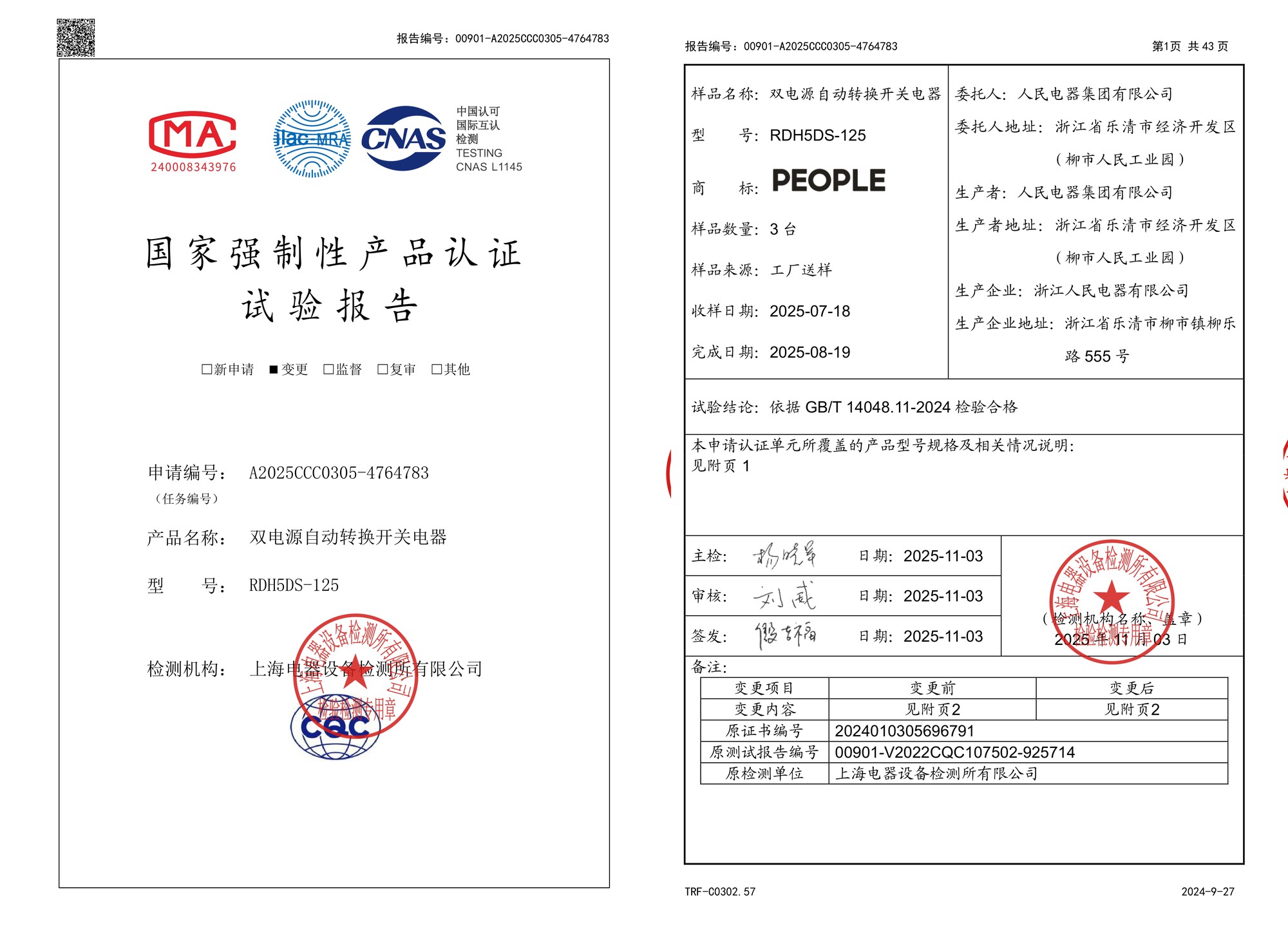 產(chǎn)品名稱:CCC試驗(yàn)報(bào)告(202511):RDH5DS-125雙電源自動轉(zhuǎn)換開關(guān)